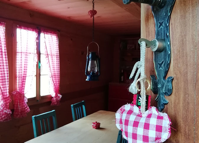 Die Küche ist mit fließendem Kaltwasser und Holzkochherd ausgestattet. (Fonduegeschirr,Racletteöfeli ist vorhanden) . Die Stube (Raumhöhe 190cm) ist mit einem Sofa, Esstisch und einem Schwedenofen für eine heimelige Wärme ausgestattet. Ebenfalls auf dem unteren Stock befindet sich das trocken WC mit Waschgelegenheit. Das Schlafzimmer befindet sich auf dem oberen Stock. Ein Massenlager mit 4 Betten, ein Einzelbett und ein Doppelbett bietet Platz für 7 Personen. Die Hütte ist mit Strom ausgestattet. Auf dem gemütlichen Aussenplatz kann man die wunderbare Bergluft geniessen und pure Erholung ist garantiert.
